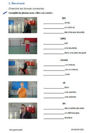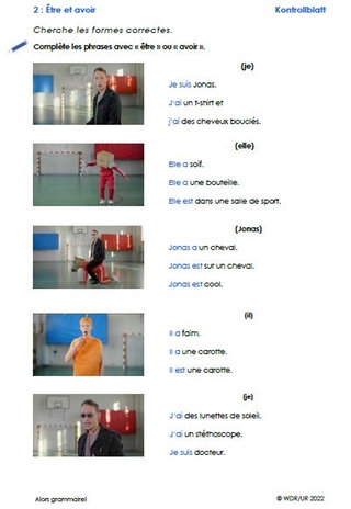 Der Film stellt die Verben „être“ und „avoir“ vor und zeigt, wie sie konjugiert werden. Außerdem gibt es Beispiele für ihre Verwendung. Die Klasse verschafft sich darüber zunächst einen Überblick mit dem gesamten Filmclip.