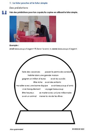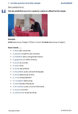 Im Anschluss arbeiten die Schülerinnen und Schüler zu zweit und sagen sich gegenseitig die Zukunft voraus. Dabei verwenden sie das futur simple. Arbeitsblatt 1 bietet dafür Stichworthilfen.