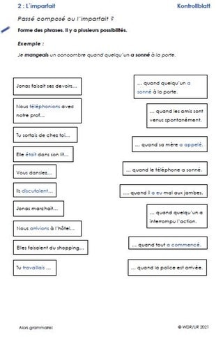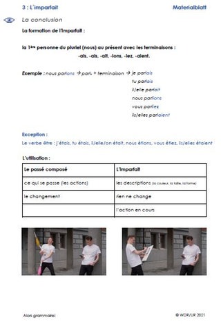 Im Rest des Films erfahren die Schülerinnen und Schüler, wann im Gegensatz zum imparfait das passé composé verwendet wird: zum Beispiel, wenn sich eine Handlung sich plötzlich ändert. Das üben die Lernenden mit Arbeitsblatt 2. Begleitend zu den Arbeitsblättern kann Materialblatt 3 als Merkhilfe ausgegeben werden.