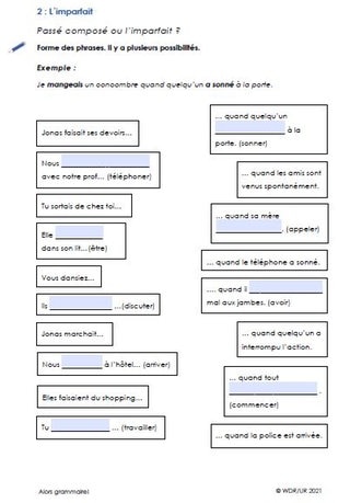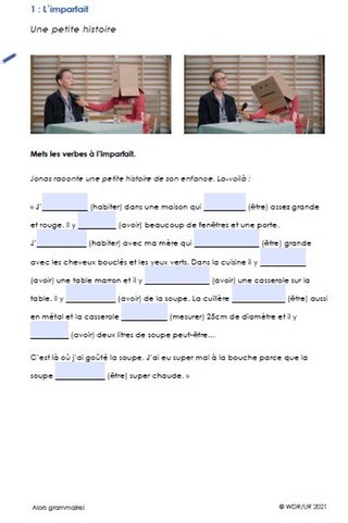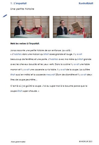 Die Klasse sieht den ersten Teil des Films bis Timecode 6:24 Min. Jonas erzählt hier im imparfait eine Geschichte mit vielen Beschreibungen. Die Schülerinnen und Schüler erhalten dann Arbeitsblatt 1, auf dem die Geschichte notiert ist, und versuchen die Verben in den richtigen Formen zu ergänzen. Bei Bedarf sehen sie den Filmausschnitt im eigenen Tempo noch einmal an – zum Beispiel auf dem Smartphone mit Kopfhörern – und ergänzen die noch fehlende Begriffe.