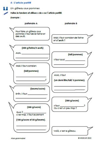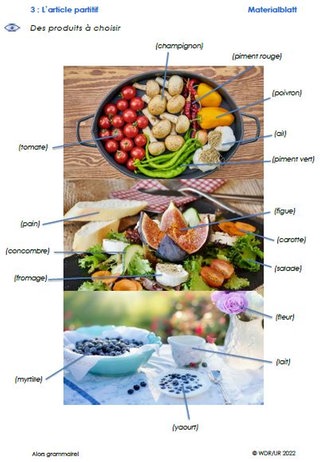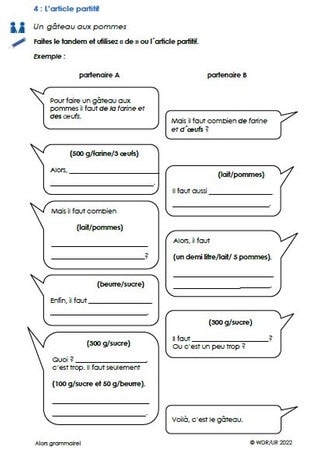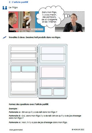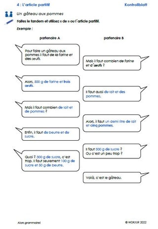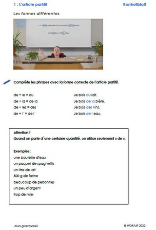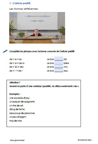 Die Klasse sieht sich zunächst den Film an und lernen darin den „Article partitif“ kennen. Danach bearbeiten sie Arbeitsblatt 1. Darauf finden sie einfache Lückensätze zum Article partitif sowie einen Infokasten dazu, wann nur „de“ verwendet wird. Das Blatt kann für die nachfolgenden Übungen als Hilfe verwendet werden.