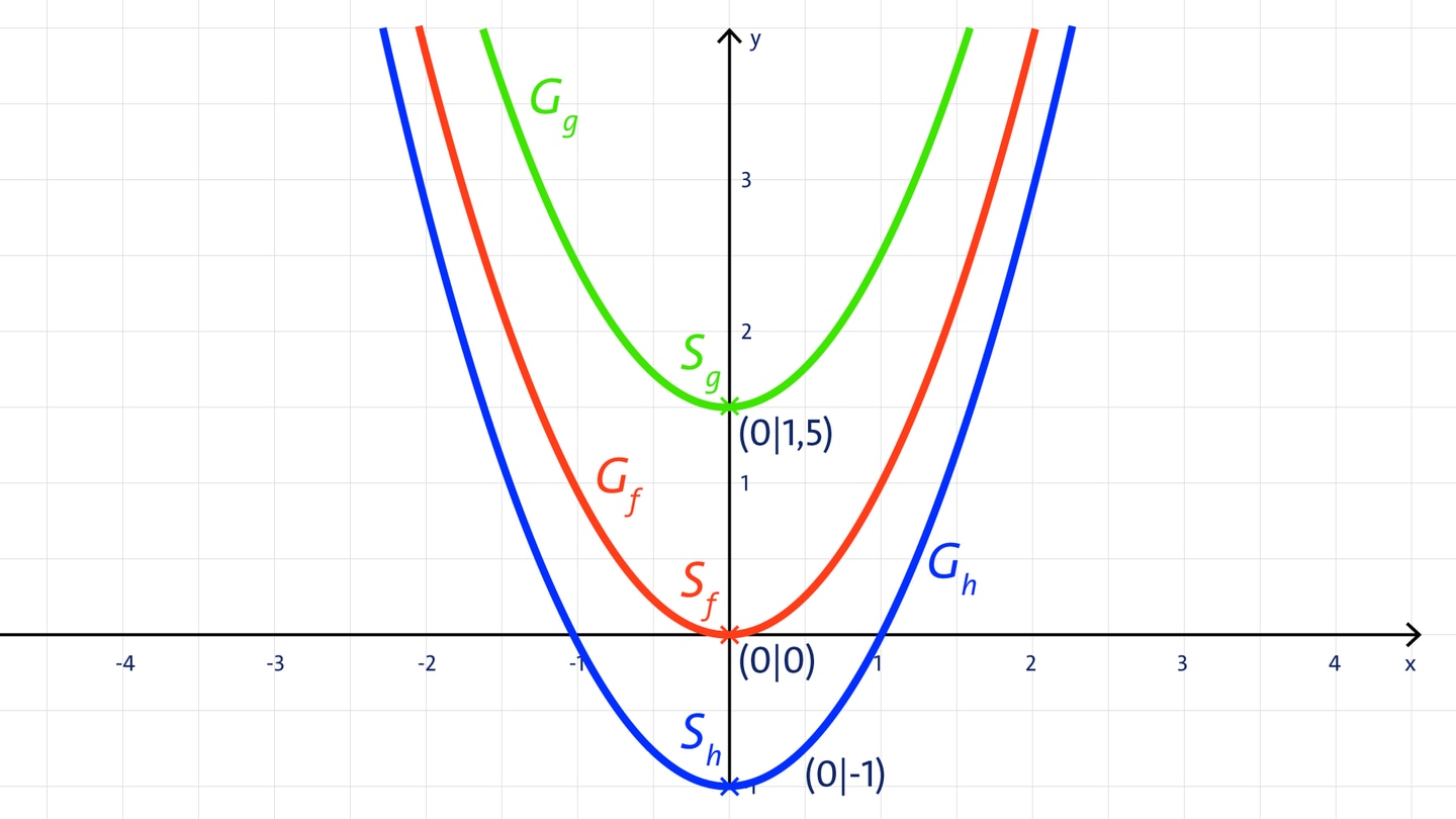 Die Graphen der Parabeln g und h sind gegenüber der Normalparabel f mit f(x) = x² auf der y-Achse verschoben.