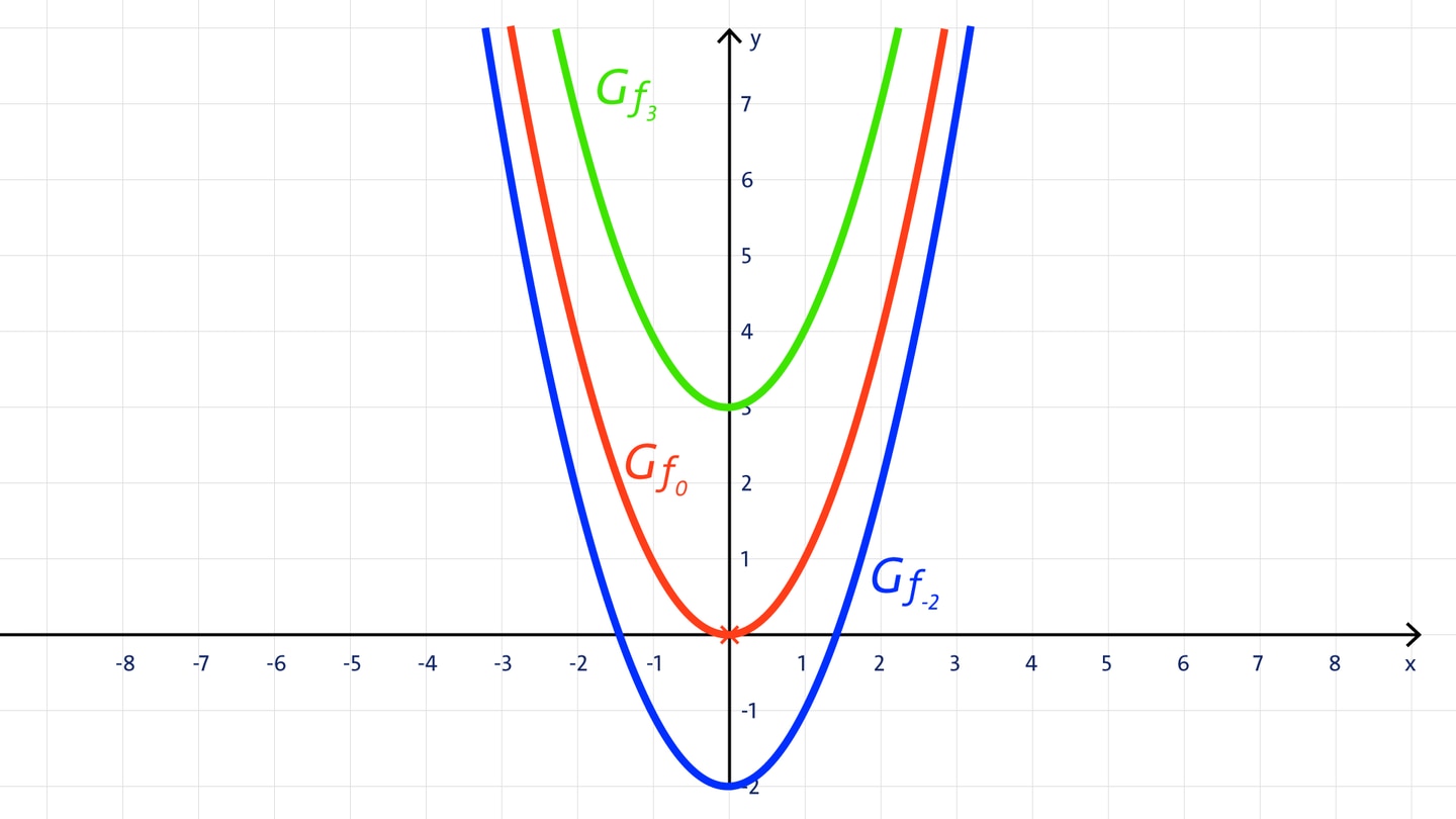 Wird zur Gleichung f(x) = x² eine Konstante c addiert, so ergibt sich die Funktionsgleichung f(x) = x² + c. Dadurch wird auch der Graph der Parabel in y-Richtung verschoben. Der Scheitelpunkt wird dann auch von S(0|0) zum Scheitelpunkt S(0|c) auf der y-Achse verschoben.