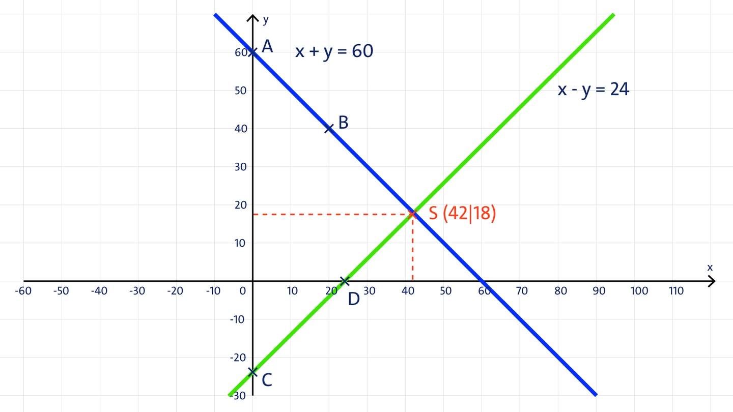 Zur Lösung der Aufgabe kann folgendes lineare Gleichungssystem verwendet werden: (I) x + y = 60 (II) x - y = 24