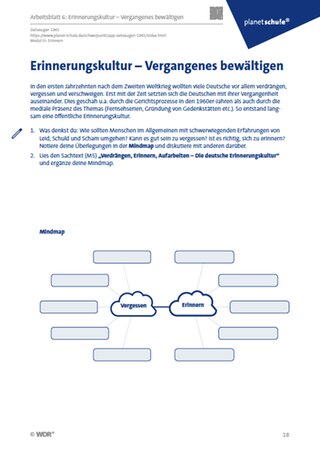 Zum Schluss soll das Bewusstsein für die Bedeutung des Erinnerns sensibilisiert werden. Die Schülerinnen und Schüler füllen zunächst eine Mindmap aus. Dabei beschäftigen sie sich mit der Frage, wie Menschen generell mit schwierigen Erfahrungen wie Leid, Schuld und Scham umgehen sollten (Arbeitsblatt 6 ). Dies fördert die Auseinandersetzung mit der eigenen Haltung, sowohl individuell als auch im kollektiven Kontext. Der Sachtext dient dann dazu, das Konzept „Erinnerungskultur“ zu vermitteln (Materialblatt 7 ). Anhand der Single-Choice-Übung können die Informationen aus dem Text gesichert werden (Materialblatt 8 ). Die Fragen, welche Formen des Erinnerns verwendet werden und wie die Erinnerungskultur der Zukunft aussehen könnte, fordern die Schülerinnen und Schüler zu kreativen Ideen heraus und regen die Diskussion über moderne und digitale Formen des Gedenkens an.