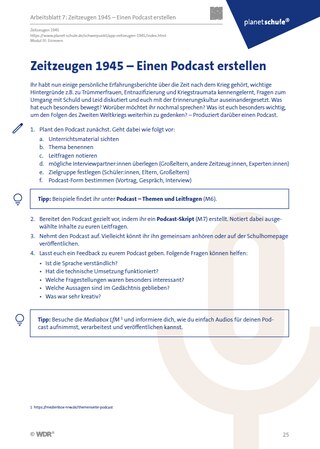 Als zusammenfassendes Lernprodukt erstellen die Schülerinnen und Schüler angeleitet einen Podcast, bei dem sie individuelle Schwerpunkte setzen können. So können sie noch einmal ausgewählte Themen zur Nachkriegszeit wiedergeben, persönlich reflektieren, einordnen und vertiefen (Arbeitsblatt 7 ). Die Schülerinnen und Schüler planen den Podcast selbstständig, indem sie Themen und Leitfragen festlegen. Dabei werden ihnen Ideen an die Hand gegeben (Materialblatt 9 ). Sie erstellen ein Skript, auf welchem der Ablauf und die Inhalte des Podcasts aufgeführt werden (Materialblatt 10 ). Dann wird der Podcast aufgenommen und eventuell veröffentlicht. Hilfreiche Tipps zur Umsetzung finden sich zum Beispiel in der Medienbox der Landesanstalt für Medien NRW . Beim Erarbeitungsprozess werden die Schülerinnen und Schüler schon dafür sensibilisiert, was bei der Vorbereitung und medialen Darstellung von historischen Themen wichtig ist. Hierauf geht das Modul „Medienreflektion“ ausführlich ein. Zum Abschluss geben sich die Schülerinnen und Schüler ein gegenseitiges Feedback.