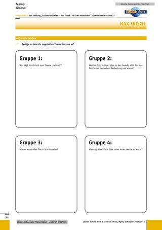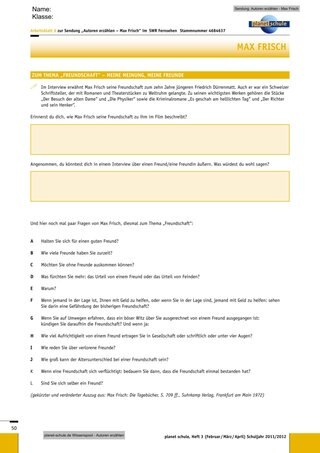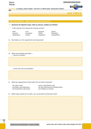 Im Anschluss daran bietet sich ein freier Austausch in der Klasse an. Einzelne Fragen können offen beantwortet, aber auch Wirkung und Absicht können thematisiert werden. Danach leitet die Lehrkraft zum Film über. Nun gilt es, Max Frisch näher unter die Lupe zu nehmen. Dazu wird die Klasse in vier Großgruppen eingeteilt, die sich jeweils Notizen zu einem inhaltlichen Aspekt des Autoren-Interviews machen sollen (Arbeitsblatt 2).