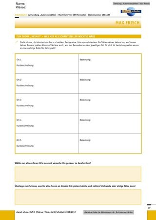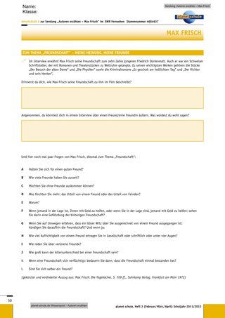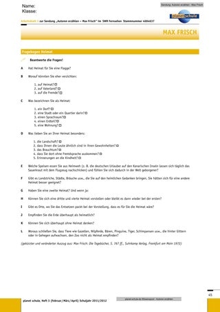 Ein kurzer Lehrervortrag führt den Schriftsteller Max Frisch ein. Dabei genügt es zunächst zu betonen, dass er sich intensiv mit dem Heimat-Begriff auseinandersetzte und dazu unter anderem einen Interviewbogen entwarf, der eine ganze Reihe interessanter, aber auch außergewöhnlicher Fragen beinhaltet. Die Schülerinnen und Schüler bearbeiten dann in Einzelarbeit Auszüge davon (Arbeitsblatt 1).