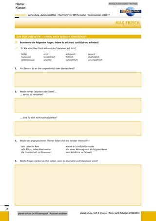 In der Reihe „Autoren erzählen“ führen die Interviews mit den Schriftstellern behutsam an deren Romane und Stücke heran. Den Schülerinnen und Schülern werden Einblicke in die Lebens- und Schaffenswelt der Literaten gewährt. Insbesondere autobiographische Ansätze und eine daraus sich ergebende Schwerpunktsetzung innerhalb des Gesamtwerks wird deutlich. Bei Max Frisch sind es beispielsweise die Themen „Heimat“ und „Freundschaft“.