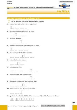 - Zum Leben Max Frischs – ein Rätsel über den Autor (Arbeitsblatt 3)