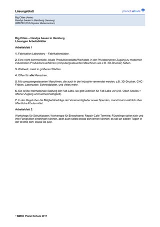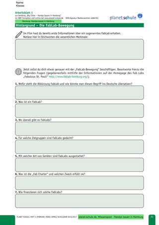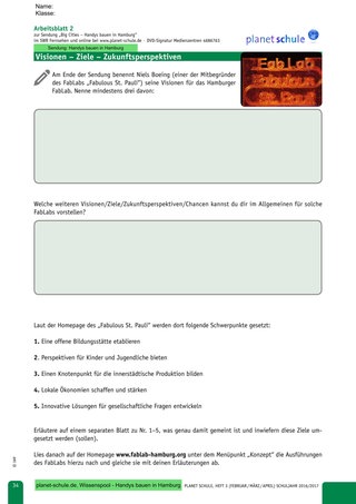 Im Anschluss an die Sendung bearbeiten die Schüler nacheinander Arbeitsblatt 1 und Arbeitsblatt 2, wahlweise in Einzel- oder Partnerarbeit. Sie erfahren hier mehr über die Hintergründe der Fab Lab-Bewegung sowie deren Ziele. Mit diesen Themen knüpfen beide Arbeitsblätter an im Film Gesagtes und Gezeigtes an, vertiefen und erweitern die Informationen jedoch deutlich.