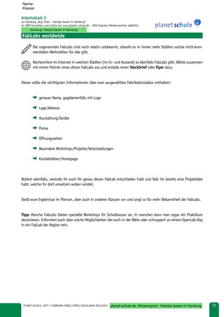 Erarbeitungsphase II und Vorstellen der Ergebnisse Im nächsten Schritt sollen die Schülerinnen und Schüler mithilfe von Arbeitsblatt 3 in Partnerarbeit nach weiteren FabLabs auf der ganzen Welt suchen und zu einem ausgewählten FabLab einen Flyer beziehungsweise Steckbrief erstellen, um diesen dann ihrer Klasse vorzustellen. Eine Wandzeitung eignet sich hervorragend, um die Ergebnisse auch anderen Klassen zugänglich zu machen.