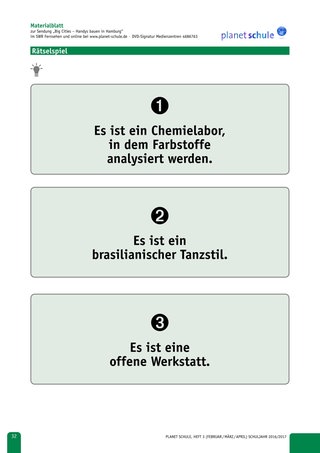 Für die Unterrichtssequenz mit dem Einsatz der Sendung „Big Cities – Handys bauen in Hamburg“ sollten insgesamt drei Unterrichtsstunden eingeplant werden.