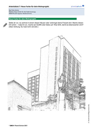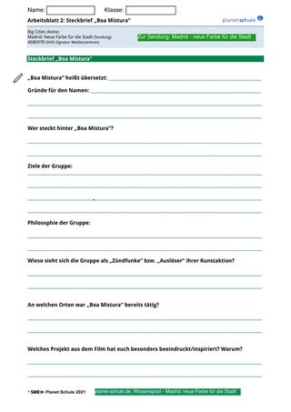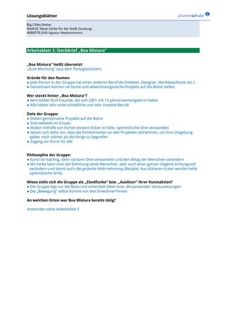 Erarbeitungsphase 1 setzt sich mit dem Wirken der Gruppe „Boa Mistura“, ebenso wie mit den damit verbundenen Wirkungsorten auseinander. In Partnerarbeit beantworten die Schüler*innen die Fragen des Steckbriefs auf Arbeitsblatt 2. Im Plenum werden die Ergebnisse schließlich besprochen und bei Bedarf noch einmal ausgewählte Szenen aus dem Film angesehen, um das neu erworbene Wissen zu vertiefen oder Unklarheiten aufzuklären. Alternativ können die Schüler*innen auch auf das Filmskript zurückgreifen (pdf online: planet-schule.de/x/bigcities-madrid-wp).