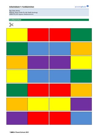 Als Einstieg verteilt die Lehrkraft den Schüler*innen unkommentiert je ein doppeltes Farbkärtchen, das vorbereitend auf Arbeitsblatt 1 ausgeschnitten (und im Falle einer Wiederverwendung laminiert) werden muss. Anschließend schaut sich die Klasse gemeinsam den Film „Big Cities. Madrid: Neue Farbe für die Stadt“ an. Aufkommende Fragen werden im Plenum besprochen.