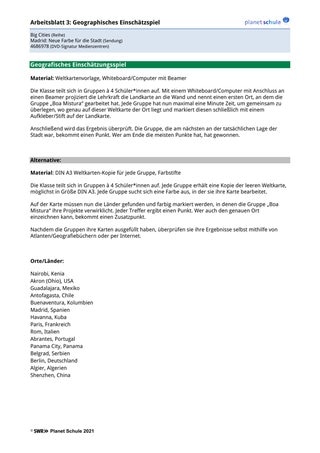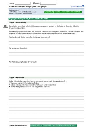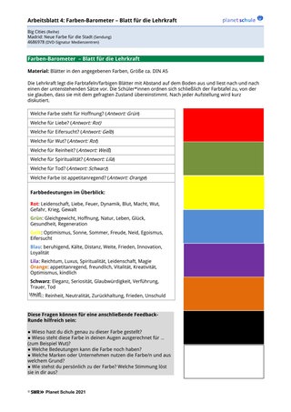 | Einstieg | - Lehrkraft verteilt Schüler*innen unkommentiert ein Farbkärtchen - zeigt anschließend den Film „Madrid: Neue Farbe für die Stadt“ - aufkommende Fragen klären - zusätzliche Frage: „In welcher Beziehung könnten die ausgeteilten Farbkärtchen zum Film stehen“? – Die finale Antwort wird offen gelassen | Plenum | Arbeitsblatt 1 „Farbkärtchen“ Film „Big Cities. Madrid: Neue Farbe für die Stadt“, Abspielgerät |