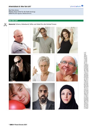 In einer zusätzlichen Übung soll der Begriff „Diversität“ noch weiter ausdifferenziert werden. Dazu werden die Bilder aus Arbeitsblatt 6 ausgeschnitten und den Schüler*innen (ohne, dass sie ihr Bild sehen) mit Klebeband auf den Rücken geklebt. Ausgestattet mit Stift und Zettel laufen die Schüler*innen nun durch den Raum. Immer wenn sie einer Person begegnen, schauen sie sich deren Bild an und sagen in wenigen Sätzen, welche allgemeine Meinung die Gesellschaft zu der Person vertritt. Ob positiv, negativ oder sogar beleidigend – bei dieser Übung ist alles erlaubt. Wichtig: Bei der Übung geht es nicht um die persönliche Meinung, sondern sie soll Stereotype, Vorurteile und das allgemeine Schubladendenken unserer Gesellschaft in den Mittelpunkt stellen. Die Person, an die die Worte gerichtet werden, macht sich Notizen dazu. Auch sie darf die Worte nicht persönlich aufnehmen, sondern muss eine Distanz zwischen der eigenen Person und dem auf dem Rücken befindlichen Foto einnehmen. Nach einigen Minuten wird die Übung beendet und die Schüler*innen bilden einen Sitzkreis. Die Bilder bleiben weiterhin auf dem Rücken kleben. Eine doppelte Version der Bilder liegt derweil in der Mitte des Kreises und lädt die Schüler*innen dazu ein, mithilfe ihrer Notizen zu erraten, welche Person sie jeweils auf dem Rücken kleben haben. Anschließend wird das Gesagte als Basis genommen, um über die gesellschaftlichen Zustände und gegebenenfalls auch eigenes Schubladendenken zu sprechen.