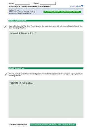 Erarbeitungsphase 4 setzt einen kurzen Schwerpunkt auf den Bereich „Heimat“. Wie bereits in Erarbeitungsphase 3 bietet Arbeitsblatt 5 die Möglichkeit, den Begriff in einem persönlichen Satz zu resümieren, denn für jeden Menschen ist Heimat etwas anderes. Heimat muss nicht einmal an einen bestimmten Ort gebunden sein. Auch hier werden die Definitionen anonym vorgelesen und unkommentiert stehen gelassen.