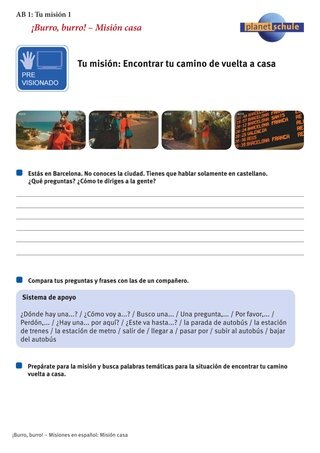 Damit die Schülerinnen und Schüler dem Film mit einer gezielten Erwartungshaltung aufmerksam folgen, erhalten sie als "Pre-visionado"-Aufgabe bereits den Auftrag, den Josina oder Lukas in der Folge erfüllen müssen. In Partnerarbeit überlegen sie, was sie sagen würden, um zum Ziel zu kommen. Arbeitsblatt 1 "Tu misión 1" erhält sprachliche Wendungen, mit denen sie Fragen formulieren können. Im Anschluss sehen sie den Film und beobachten, wie Lukas oder Josina die Aufgabe in der fremden Sprache lösen.