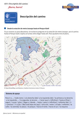 Arbeitsblatt 5 enthält eine mündliche Aufgabe: Es zeigt einen Stadtplanauszug von Barcelona und die Schülerinnen und Schüler sollen den Weg von der Metrostation bis zum Eingang des Parque Güell beschreiben.