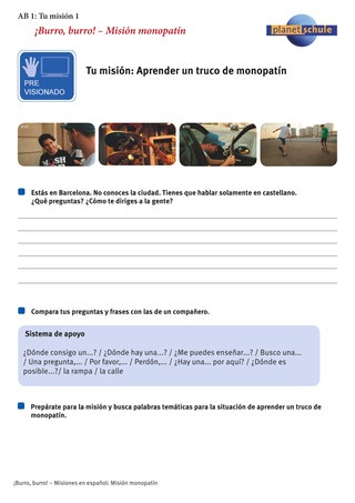 Damit die Schülerinnen und Schüler dem Film mit einer gezielten Erwartungshaltung aufmerksam folgen, erhalten sie als "Pre-visionado"-Aufgabe bereits den Auftrag, den Josina oder Lukas in der Folge erfüllen müssen. In Partnerarbeit überlegen sie, was sie sagen würden, um zum Ziel zu kommen. Arbeitsblatt 1 "Tu misión 1" erhält sprachliche Wendungen, mit denen sie Fragen formulieren können. Im Anschluss sehen sie den Film und beobachten, wie Lukas oder Josina die Aufgabe in der fremden Sprache lösen.