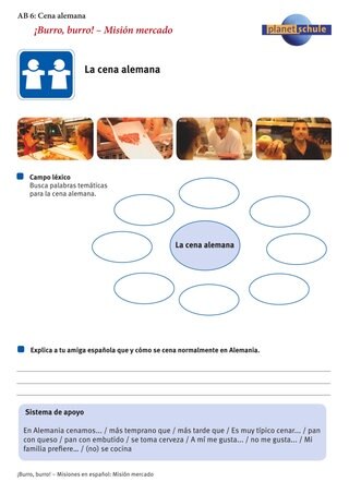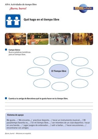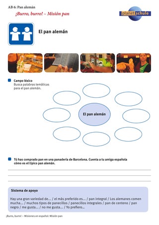 Die Schülerinnen und Schüler üben nun mündlich ähnliche Gesprächssituationen, um den Wortschatz im jeweiligen Themenfeld anzuwenden und zu erweitern. Dazu erhalten sie auf Arbeitsblatt 3 "Tu misión 2" eine ähnlich gelagerte Aufgabe wie die im Film. Das Arbeitsblatt enthält im "Sistema de apoyo" nützliche Ausdrücke und Wendungen. Die Schüler bereiten sich auf das Gespräch vor und notieren einige Sätze. Dann spielen sie die Situation in der Klasse oder in den Gruppen vor, die denselben Film bearbeitet haben.