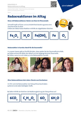 Die im Film gezeigten weiteren Redoxreaktionen (Rosten, Dauerwelle, Fotosynthese) werden gemeinsam analysiert. Dazu kann Arbeitsblatt 4 „Redoxreaktionen im Alltag“ verwendet werden.