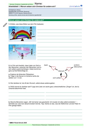 | Einstieg | „Im Film hieß es: ‚Gott ist die Liebe‘. Wie kommt man darauf?“ Eventuell das Schaubild aus dem Film zur Erinnerung betrachten. | 2. Bild auf Arbeitsblatt 1; offenes Unterrichtsgespräch |