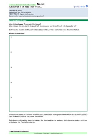 | Erarbeitung 2 | Die Schülerinnen und Schüler entwickeln in Stichpunkten ihre eigene Kirchenvision. | Einzelarbeit, Arbeitsblatt 6: „Ich habe einen Traum“ |