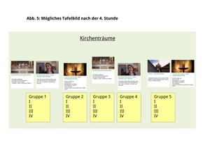 In der vierten Stunde wird zunächst den festgehaltenen, selbst erlebten Kirchenmerkmalen und denen von Alyn eine Schilderung der Jerusalemer Urgemeinde aus der Apostelgeschichte gegenübergestellt und mit diesen verglichen. Danach erhalten die Schülerinnen und Schüler Gelegenheit, stichpunktartig ihre eigene Vision einer akzeptablen / idealen Kirche zu skizzieren. Da Kirche ein Gemeinschaftsunternehmen ist mit zum Teil sehr disparaten Standpunkten, bekommen die Lernenden die Aufgabe, ihre Kirchenvision mit denen ihrer Tischgruppennachbarn so weit in Einklang zu bringen, dass jede Gruppe eine eigene, aus vier Merkmalen bestehende „Kirchenvision“ beschreibt, diese im nächsten Arbeitsschritt vor der Klasse präsentiert und innerhalb eines „Kirchen-Koordinatensystems“ positioniert.