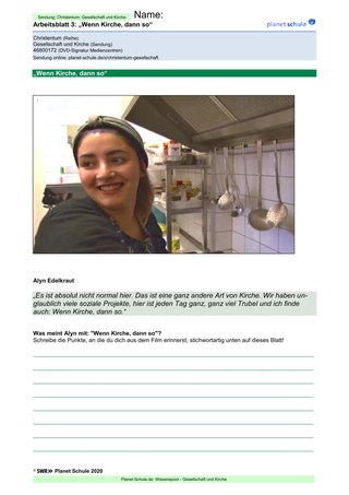 Neben dem Thema „Warum setzen sich Christen für andere ein?“ zieht sich noch ein weiterer roter Faden durch den Film. Es geht um „eine andere Gestalt von Kirche“. Dieses Motiv eröffnet die Möglichkeit, mit den Schülern und Schülerinnen das eigene Verhältnis zur (eigenen) Kirche zu beleuchten, ausgehend von den Grundfragen: Wie sieht mein Verhältnis zur Kirche aus? und: Wie wünsche ich mir Kirche?