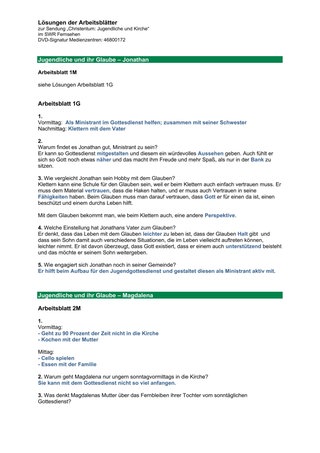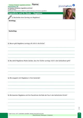 2. Jugendgottesdienst Als Überleitung zu Arbeitsblatt 5: Vertiefung 2 kann die Aussage von Magdalena „Dadurch, dass ich mich engagiere und so mehr mitmischen kann, ist mein Verhältnis zu Kirche besser geworden“ nochmals aufgegriffen werden und die Schülerinnen und Schüler zum Planen eines Jugendgottesdienstes für die Schule motivieren.