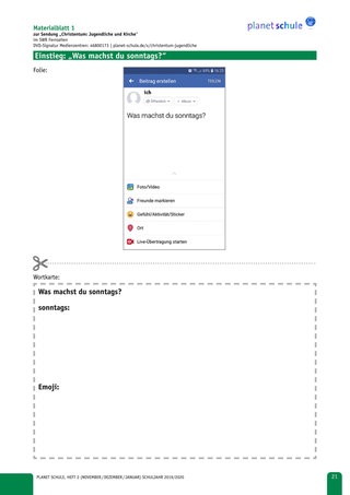 Die Schülerinnen und Schüler verfassen nun einen Post und malen gegebenenfalls Emojis (Kirche, Schlafen, Frühstück, Sport,..) darauf. Der Post kann anonym verfasst werden oder die Schülerinnen und Schüler geben sich einen Usernamen. Anschließend lässt die Lehrkraft einige vorlesen, liest einige Posts anonym vor oder zeigt sie mithilfe eines Visualizers.