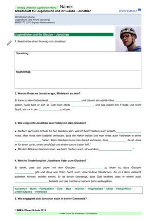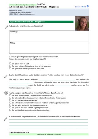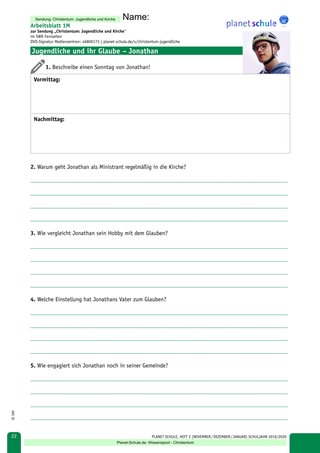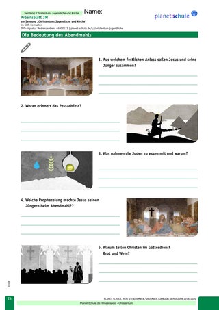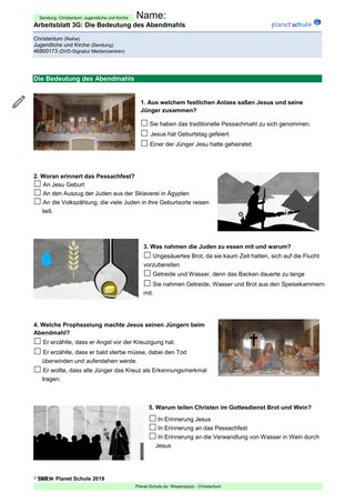 Nun erhalten alle in der Klasse je zwei Arbeitsblätter: Arbeitsblatt 1 „Jonathan“ und Arbeitsblatt 2 „Magdalena“ entweder als leichtes oder mittleres Niveau. Möglich ist es auch, Arbeitsblatt 1 an eine Hälfte der Klasse zu verteilen und Arbeitsblatt 2 an die andere. Die Arbeitsblätter werden während des Films ausgefüllt. Des Weiteren stehen für den Film auch die Arbeitsblätter 3 „Die Bedeutung des Abendmahls?“ und 4 „Christliche Religionen“ zur Verfügung.