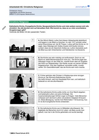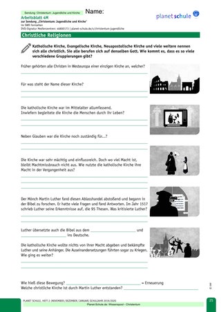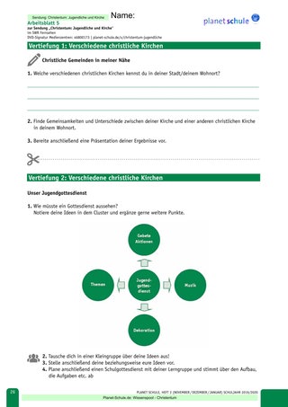 | Vertiefung | Die Schülerinnen und Schüler arbeiten entweder an einer, zwei oder drei Vertiefungsaufgaben weiter (Präsentation christliche Kirchen vorbereiten, Jugendgottesdienst planen, Talkshow-Teilnahme vorbereiten) | Einzel-, Partner- oder Gruppenarbeit | Arbeitsblatt 5: Vertiefung 1-2 Arbeitsblatt 6: Vertiefung 3 |