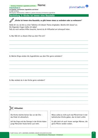 3. Die Kirche ist immer eine Baustelle Die Schülerinnen und Schüler bereiten sich mithilfe des Arbeitsblatts 6: Vertiefung 3 auf eine Talkshow zum Thema „Kirche ist immer eine Baustelle, es gibt immer etwas zu verändern oder zu verbessern“ vor. Dazu gibt es auch zwei Hilfskärtchen, die die Lehrkraft kopiert, zuschneidet und auf dem Pult bereitlegt.
