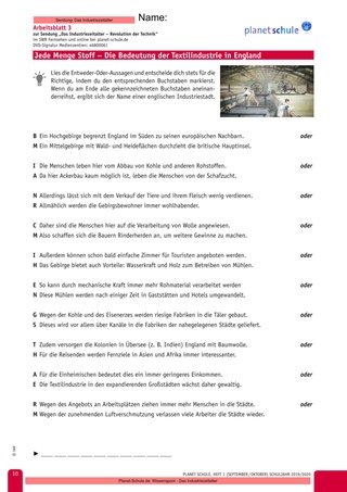 Die Entwicklung der Textilindustrie in England – dem Ursprungsland der Industrialisierung – wird mithilfe von Entweder-Oder-Aussagen verdeutlicht. Die Selbstüberprüfung erfolgt anhand eines Lösungsworts.