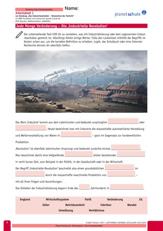 Durch plausibles Zuordnen vorgegebener Wörter beziehungsweise mittels Recherche-Optionen kann der Lückentext zur Definition des Begriffes ,Industrielle Revolution‘ ausgefüllt werden.