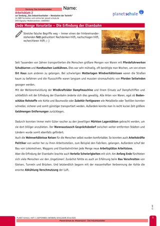 Die vorteilbringende Entwicklung der Eisenbahn wird mittels eines ‚Falsch-Textes‘ erarbeitet. Erneut können die Schülerinnen und Schüler durch logisches Denken beziehungsweise durch Nachschlagen die Lösung erschließen.