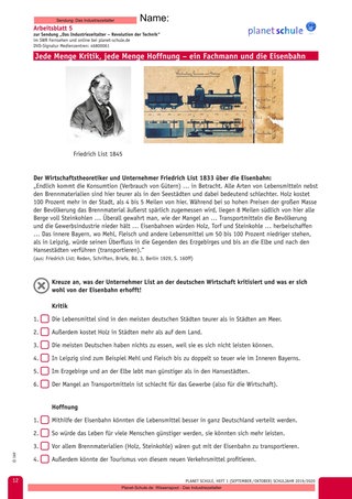 Arbeit mit einer Originalquelle als fachimmanente Methode zur Bedeutung der Eisenbahn in Deutschland. Die Quellenauswertung erfolgt durch die Richtig-Falsch-Beurteilung bezüglich der Kritik an bestehenden Verhältnissen beziehungsweise der Hoffnungserwartung durch die Innovation.