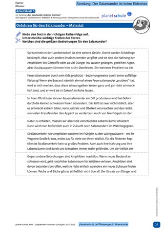 Der Text wird von den Schüler*innen in die richtige Reihenfolge gebracht. Danach sollen wichtige Stellen im Text unterstrichen werden. Es wird deutlich, dass der Mensch die Hauptbedrohung für den Salamander darstellt.
