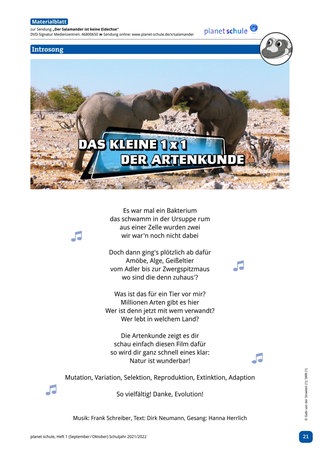 | Einstieg | Lied „Das kleine 1x1 der Artenkunde“ Stummer Impuls: Bild eines Feuersalamanders und einer Eidechse zeigen; Kommentare der Schüler*innen entgegennehmen | Plenum | Liedtext: Materialblatt Bild Feuersalamander + Eidechse |