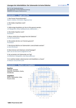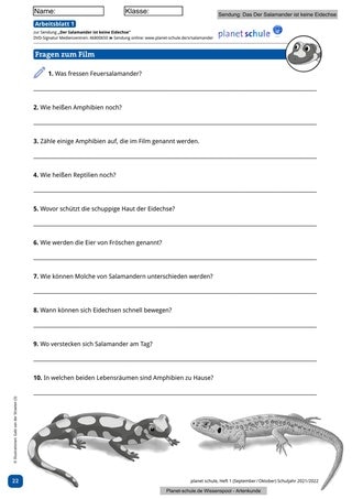 Die Unterrichtseinheit kann mit dem Singen des vorher eingeübten Liedes „Das kleine 1x1 der Artenkunde“ beginnen. Als stummer Impuls wird den Schüler*innen dann ein Bild von einem Feuersalamander und einer Eidechse gezeigt. Die Kommentare der Schüler*innen werden entgegengenommen. Anschließend wird der Film gezeigt. Wenn im Anschluss alle Fragen geklärt sind, bearbeiten die Schüler*innen in Partnerarbeit das Arbeitsblatt 1 „Fragen zum Film“ und beginnen danach mit den Arbeitsblättern 2 bis 5 in selbstgewählter Reihenfolge. Es bietet sich an, den Schüler*innen die Möglichkeit zu geben, den Film nochmals selbstständig zu schauen, um offene Fragen zu klären.