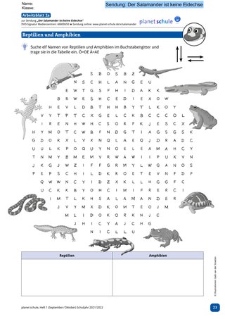 Im Buchstabengitter sind elf Namen von Reptilien und Amphibien versteckt. Die Schüler*innen suchen die Wörter im Buchstabengitter und tragen die Tiernamen, nach Reptilien und Amphibien sortiert, in eine Tabelle ein. Die zu suchenden Tiere sind als Hilfe alle auf dem Arbeitsblatt abgebildet. Auf Arbeitsblatt 2b stehen für das leichtere Niveau bereits die Namen der Tiere bei den Tierbildern.