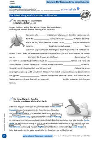 In einem Lückentext wird die Entwicklung des Salamanders beschrieben. Die Schüler*innen tragen die Wörter sinngemäß in die Lücken ein. Aufgabe 2 zeigt, wie die Eidechse sich im Gegensatz zu Amphibien ganz ohne die Notwendigkeit von Wasser entwickelt.