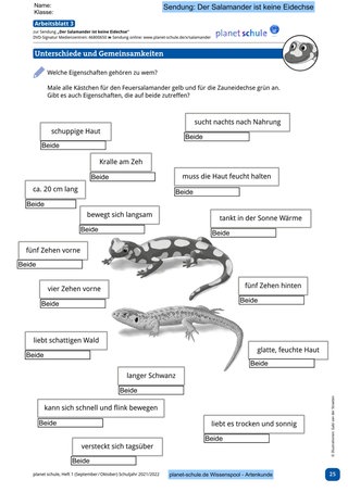Die Schüler*innen ordnen auf diesem Arbeitsblatt Salamander und Eidechse deren Eigenschaften zu, indem sie die Kästchen in der entsprechenden Farbe ausmalen. Eigenschaften, die zu beiden Tieren gehören, sollen entsprechend mit beiden Farben ausgemalt werden.