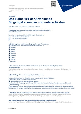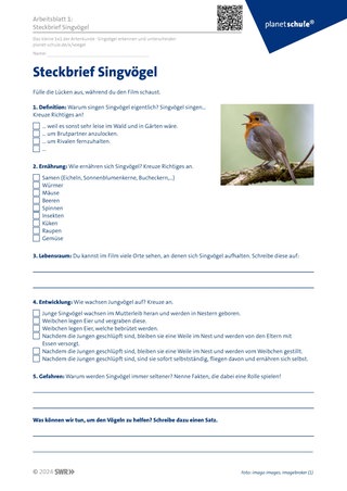 Während des Films einen Steckbrief (Arbeitsblatt 1) über Singvögel erarbeiten: Definition Singvögel, Ernährung, Lebensraum, Entwicklung