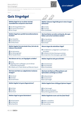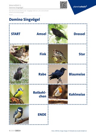 Material: Film „Singvögel erkennen und unterscheiden“, Audio oder Internetzugang, Arbeitsblätter 1-3, Materialblätter 1-2 (Domino und Quiz)