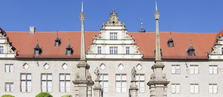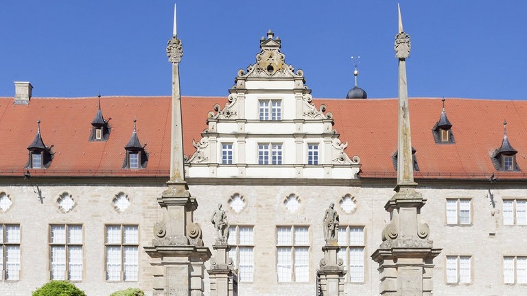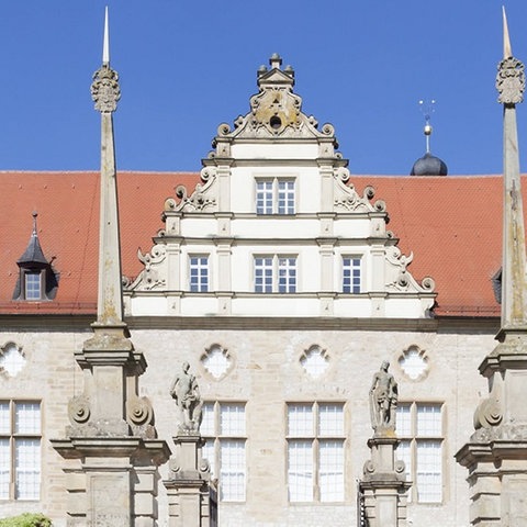 Der kunstliebende und gebildete Graf Wolfgang II. von Hohenlohe fand in Weikersheim, im Taubertal, einen idealen Bauplatz für sein repräsentatives Renaissanceschloss. Hier wurden Konrad von Weikersheim und Heinrich von Hohenlohe erstmals als Herren einer Ringmauerburg mit Wassergraben und Bergfried genannt. Als Graf Wolfgang II. und seine Ehefrau Magdalena gegen 1586 durch Erbteilung in den Besitz der alten Burg kamen, verlegten sie ihren Wohnsitz ins Taubertal und begannen ihre Ideen für einen Renaissancepalast zu realisieren. Es entstand, auf dem Grundriss eines Dreiecks – eine außerordentlich seltenes architektonisches Element -, ein Schloss mit einer prachtvollen Giebelfassade im Renaissance-Stil. Dabei bezog der Bauherr den staufischen Bergfried mit in seine Umbaupläne ein. Den Turm schmückt eine barocke Haube, die vorausschauend auf die kommende Kunstepoche hinweist.
