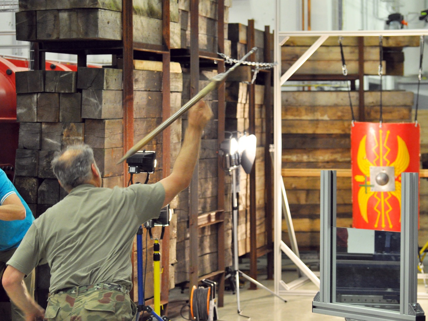 Naturwissenschaftler des Fraunhofer-Instituts in Kandern begleiten die wissenschaftlichen Waffen-Experimente. Sie messen mit modernsten Methoden die Durchschlagskräfte, Geschwindigkeiten und Reichweiten der antiken Waffen. Mit erstaunlichen Ergebnissen: Der Pfeil eines römischen Scorpio-Geschützes durchschlägt einen aufwändigen, mehrschichtigen Schild römischer Bauart beinahe ungebremst. Der Träger hatte bei einem Treffer keine Überlebenschance. Auch das Pilum, der standardisierte Wurfspeer der Römer, war eine extrem effektive Waffe. Aus einer Entfernung von ca. 20 Meter geworfen durchschlug auch er den Schild des Gegners, blieb aber darin stecken und machte den Schild schwer und unhandlich.